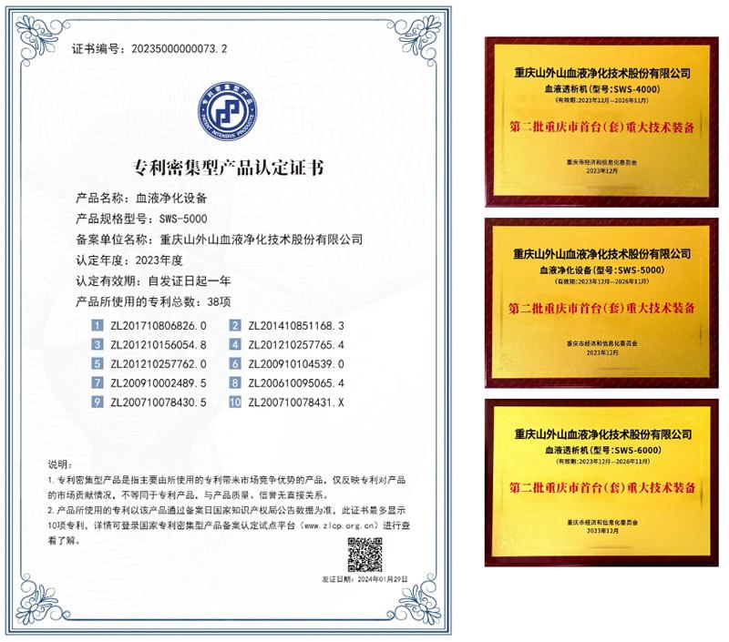 除了入選國(guó)家高端醫(yī)療裝備推廣應(yīng)用項(xiàng)目目錄,SWS-5000連續(xù)性血液凈化設(shè)備還通過(guò)了首批國(guó)家專利密集型產(chǎn)品認(rèn)定,與山外山SWS-4000、SWS-6000血液透析機(jī)一同被認(rèn)定為第二批重慶市首臺(tái)(套)重大技術(shù)裝備產(chǎn)品。這些先進(jìn)而精良的血液凈化設(shè)備,鐫刻著山外山的技術(shù)創(chuàng)新力量,也見(jiàn)證了中國(guó)追趕世界的速度。